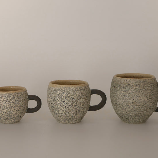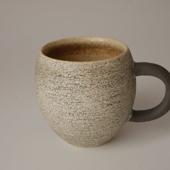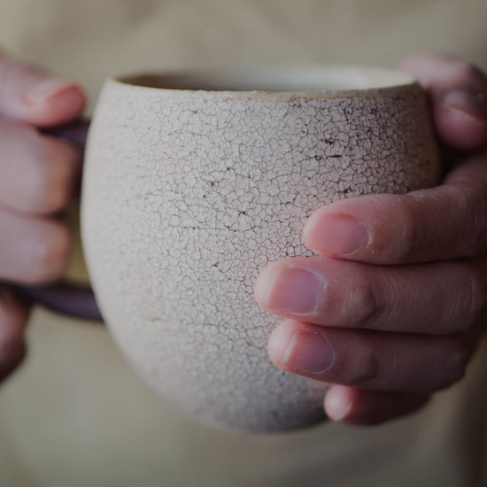 The body of the cup offers a distinctive, tactile experience with its textured, grainy surface. Inside, the glaze is crafted primarily from the volcanic sands of the Shirasu Highlands, creating a natural finish that beautifully complements any beverage. The handle is left as unglazed "yakishime" stoneware, retaining the raw color of the earth to look as if a small creature is clinging to the side.