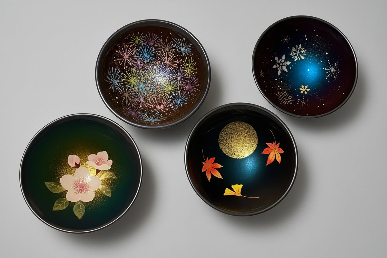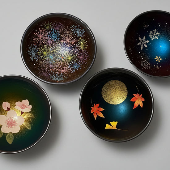 This sake cup is a fusion of cutting-edge metalwork from Tsubame-Sanjo, Niigata, and traditional Japanese artistry. Crafted from stainless steel and treated with a special coloring process, it is meticulously finished with "Makie" lacquerwork using a unique baking technique. The exquisite designs are hand-painted using authentic Urushi lacquer, pure gold, and platinum.