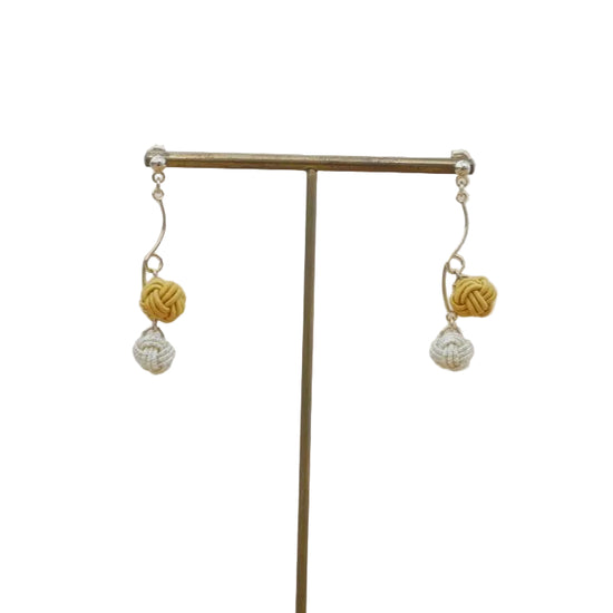 These earrings feature two connected Tamamusubi knots, a traditional Mizuhiki knotting style, designed to sway gently with movement.