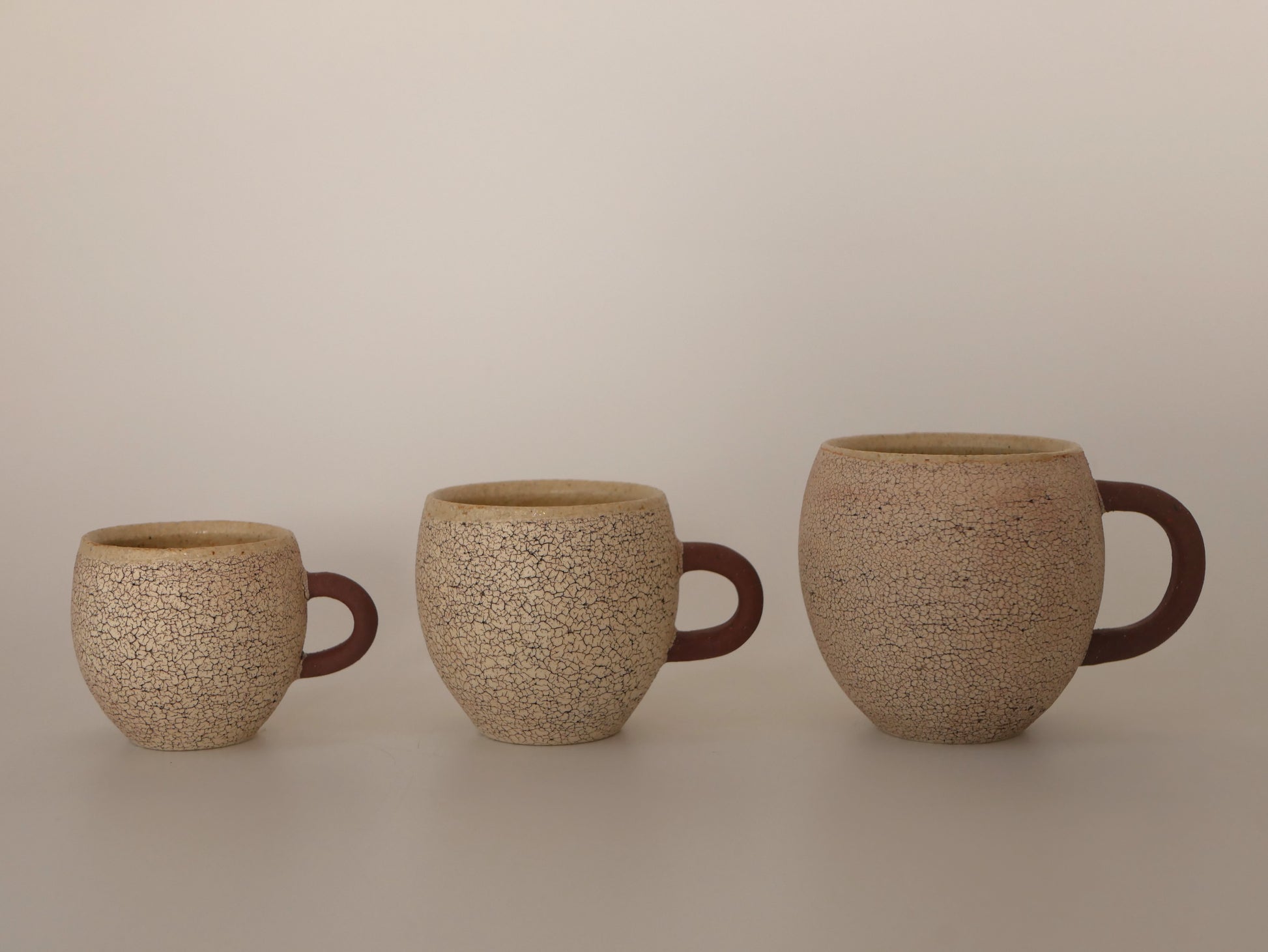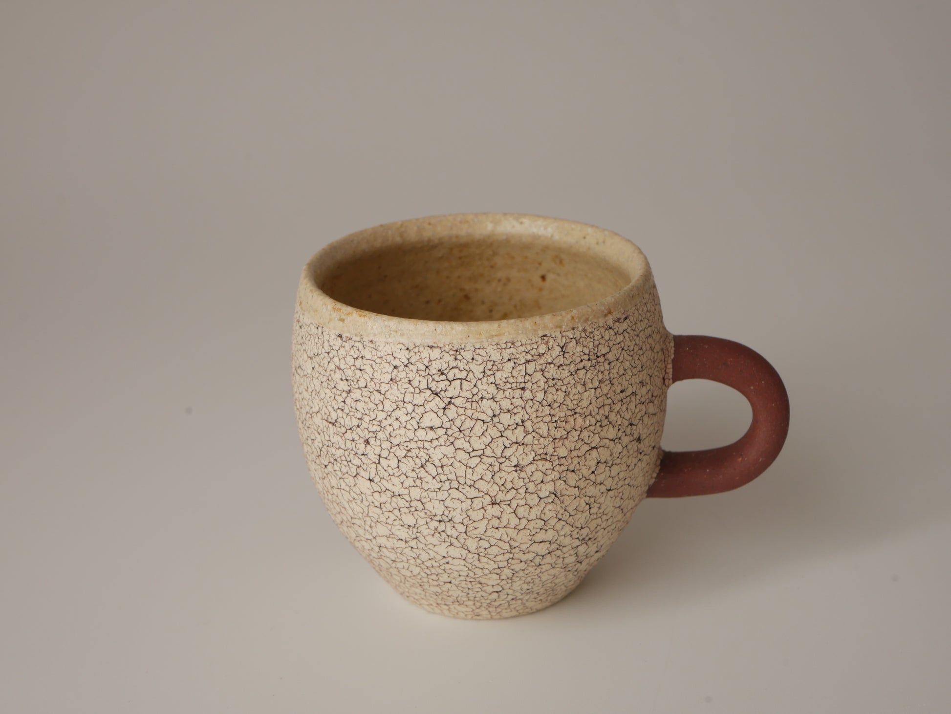The body of the cup offers a distinctive, tactile experience with its textured, grainy surface. Inside, the glaze is crafted primarily from the volcanic sands of the Shirasu Highlands, creating a natural finish that beautifully complements any beverage. The handle is left as unglazed "yakishime" stoneware, retaining the raw color of the earth to look as if a small creature is clinging to the side.