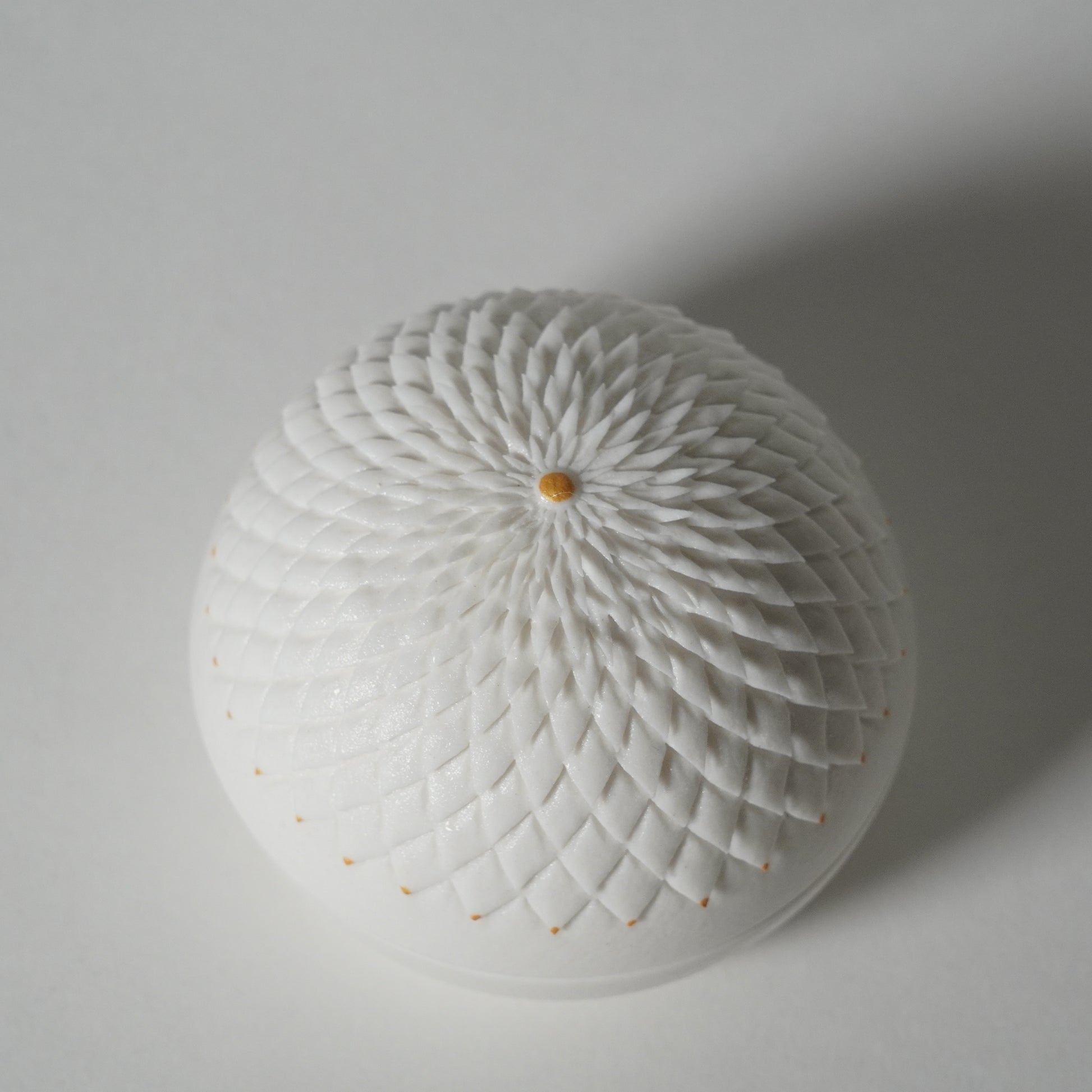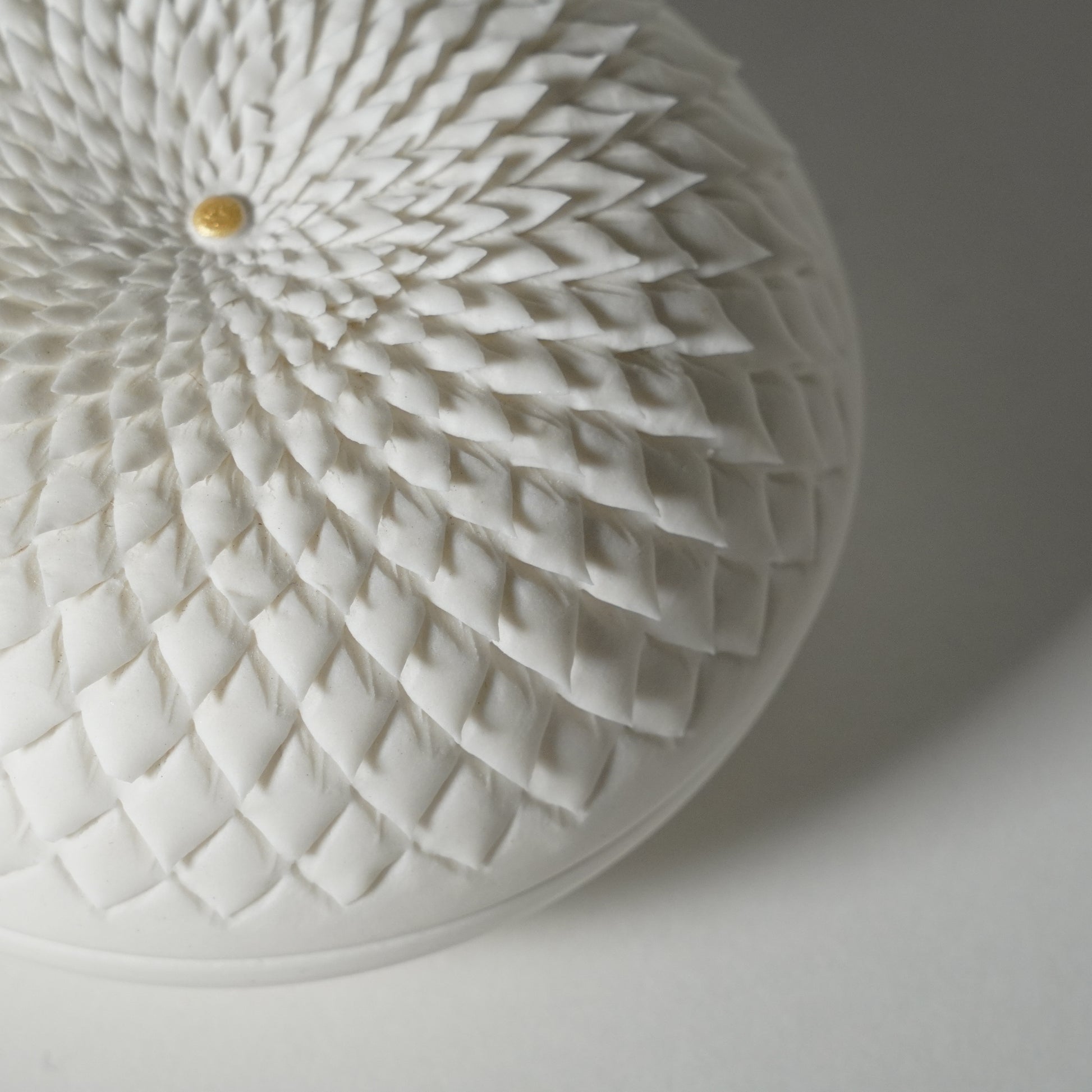 Inspired by the traditional Japanese sweet-making technique Hasamigiku, I developed a unique method of cutting into unfired clay with scissors, which I call Tsuchibasami—“Scissoring Clay.” I apply this delicate and intricate pattern mainly to flower vases and illuminators. Many of my works reflect the beauty of chrysanthemums, but I also explore other motifs such as feathers and fish scales.